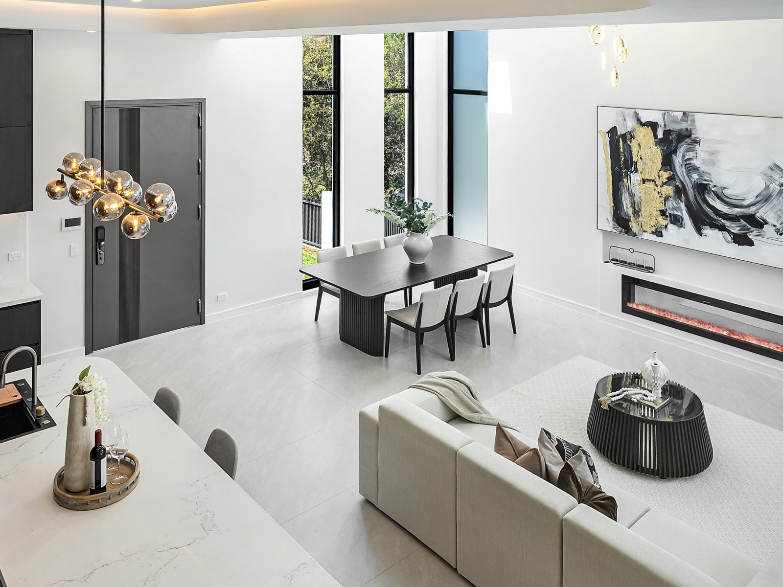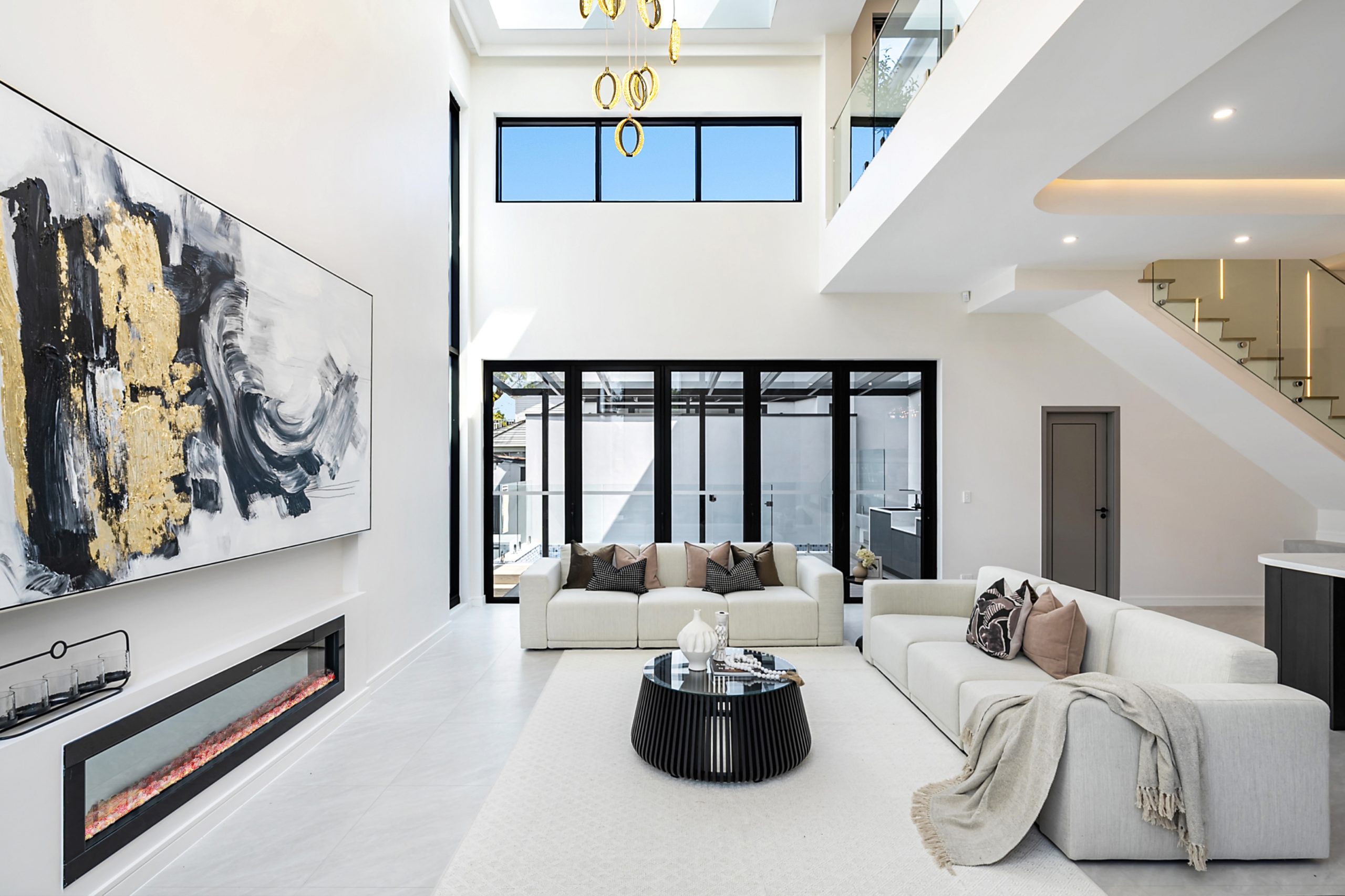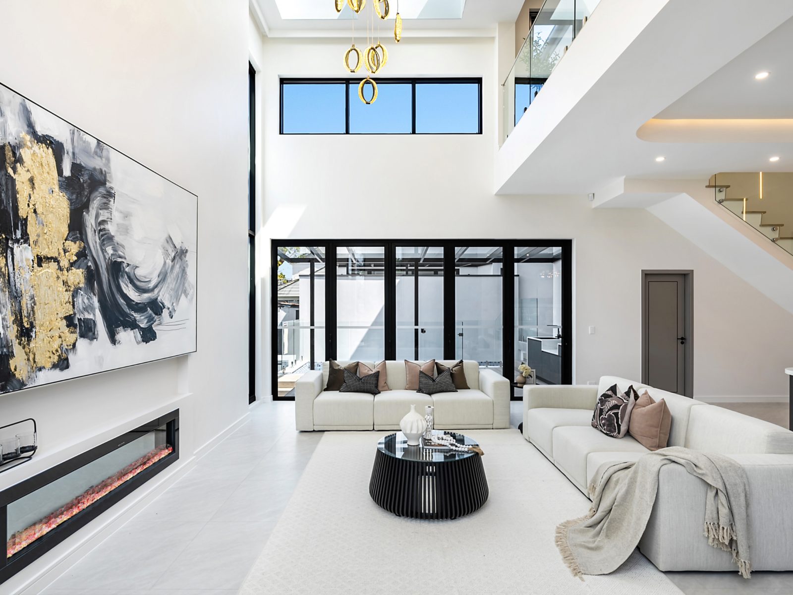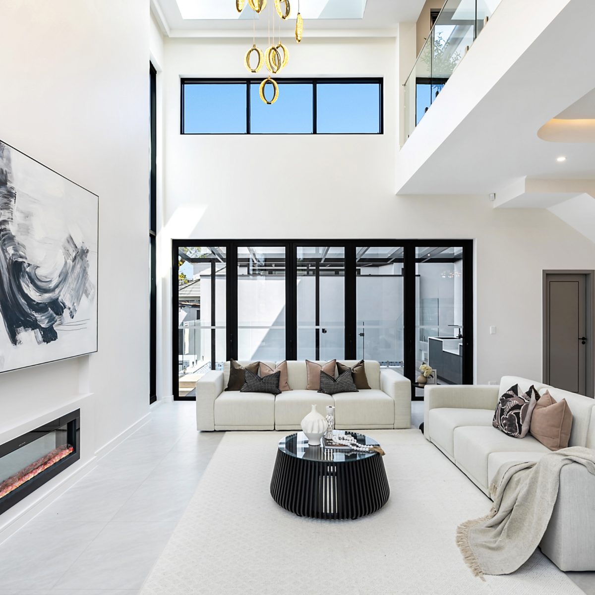 The design focuses on light, proportion, and spatial flow, using large openings and double-height spaces to create a refined and highly liveable environment.
