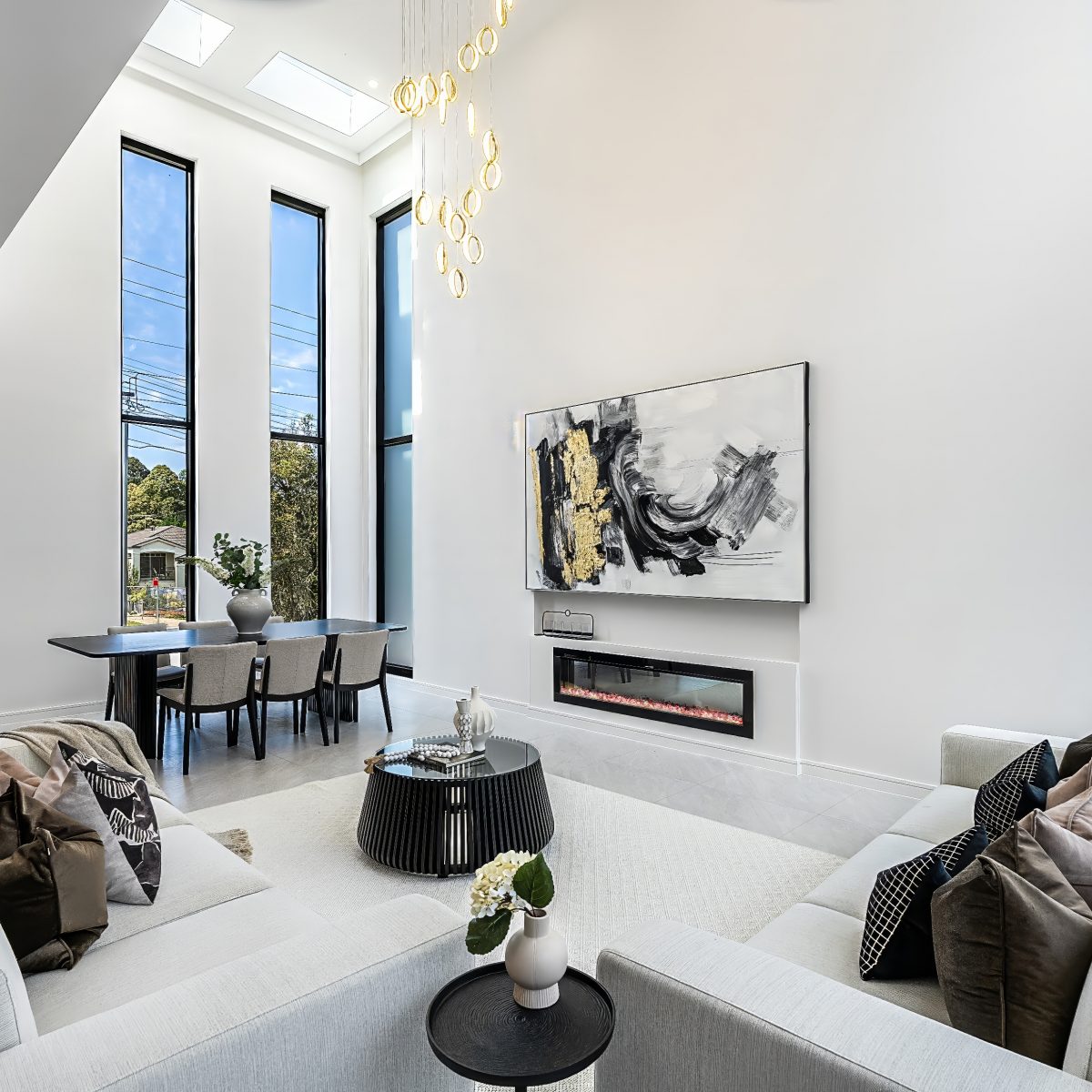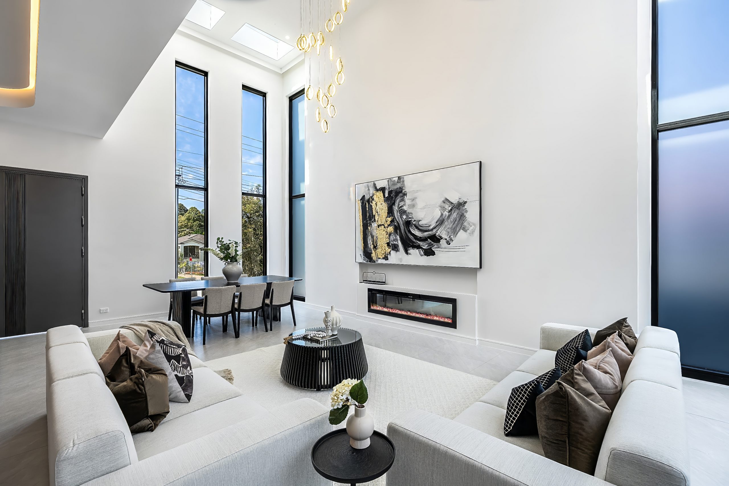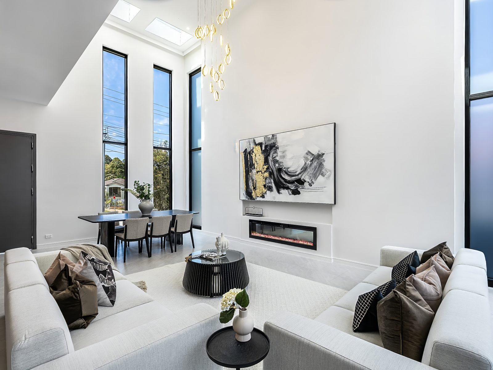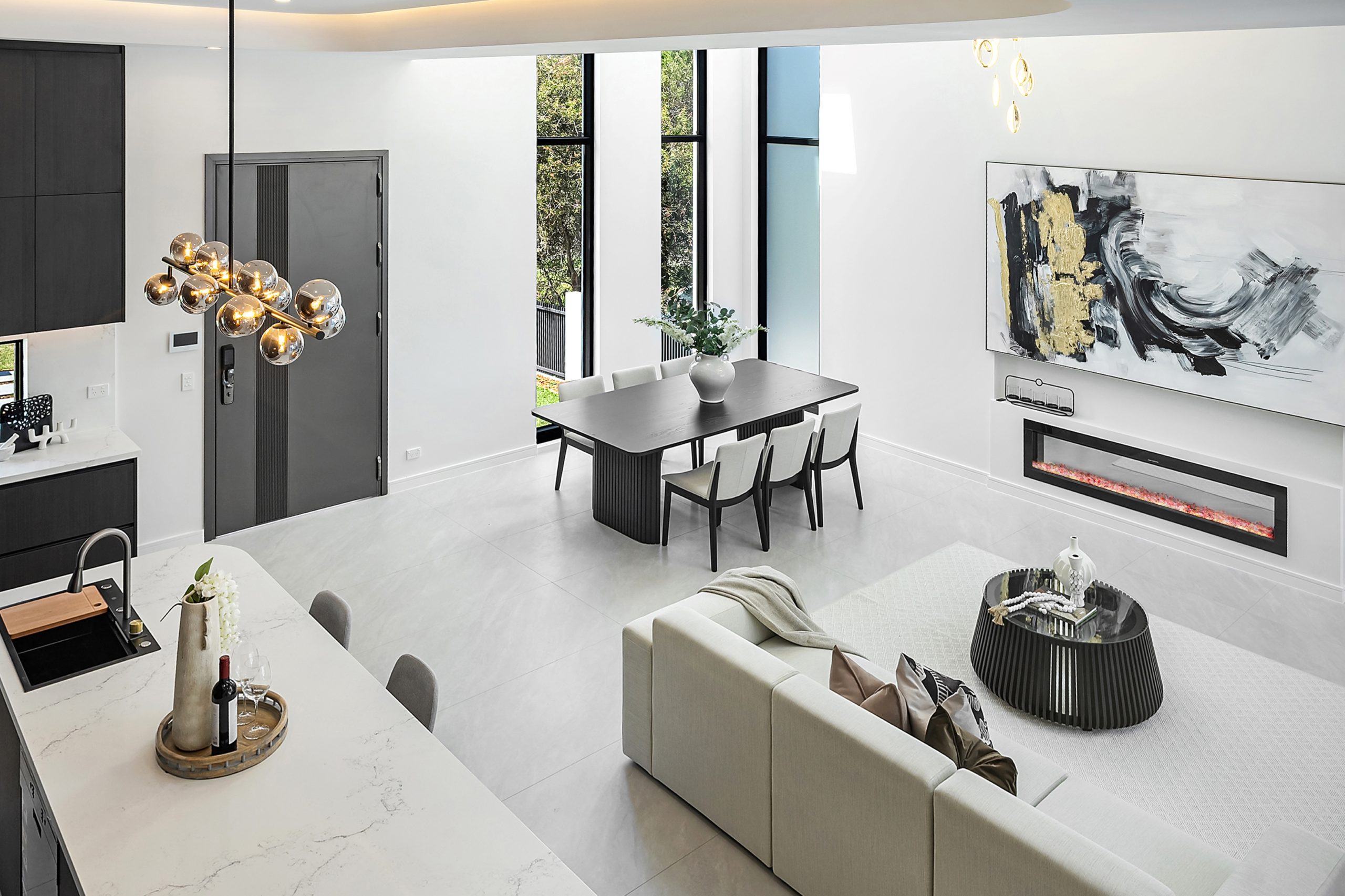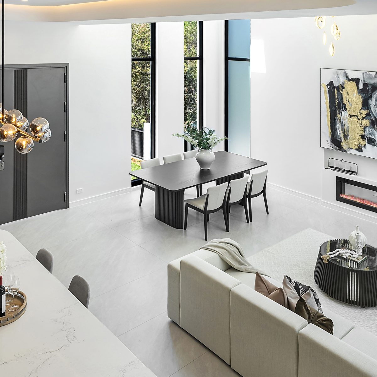 The design focuses on light, proportion, and spatial flow, using large openings and double-height spaces to create a refined and highly liveable environment.
