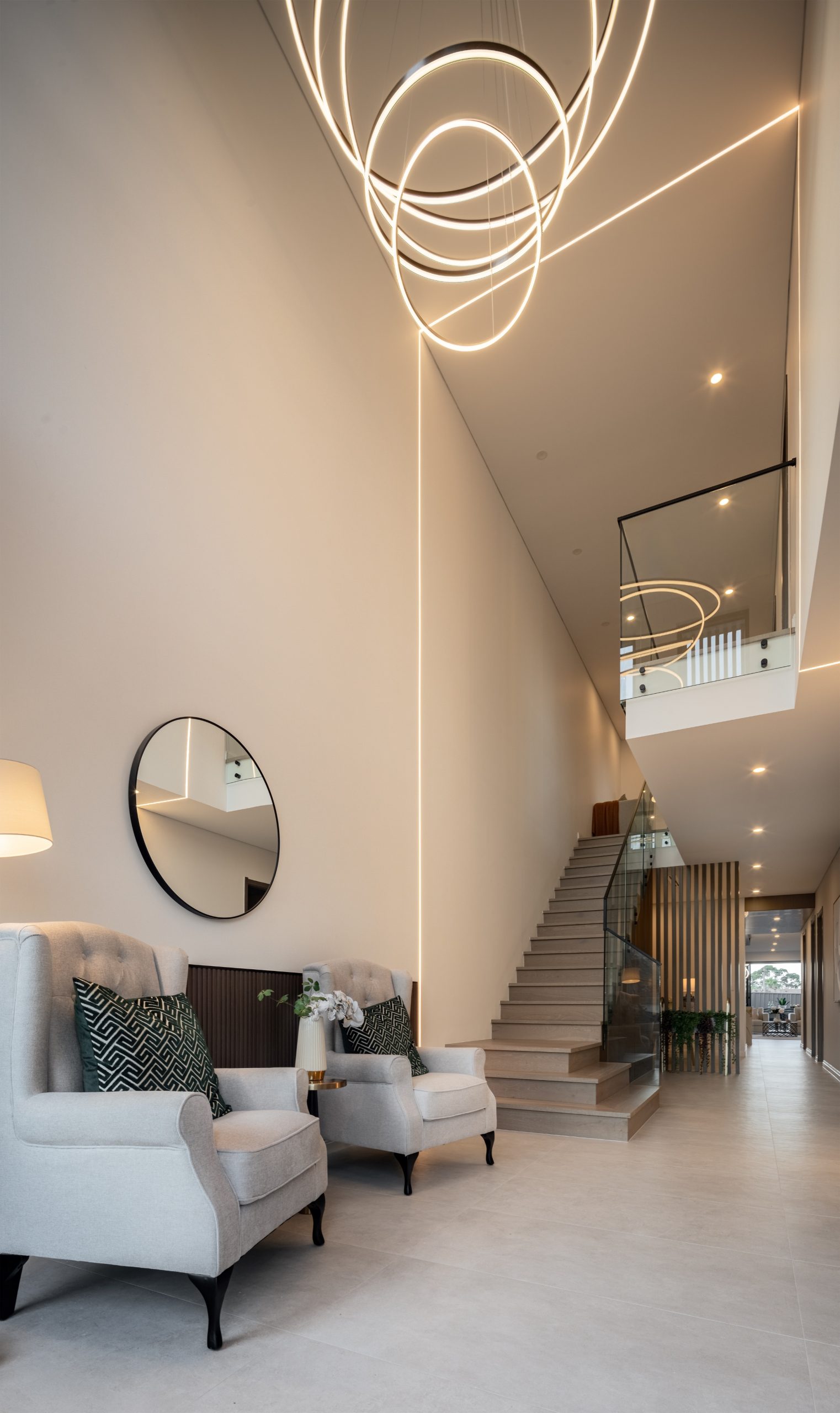 The design focuses on clean lines, vertical volume, and material contrast, using a central void to enhance light and spatial connection. A refined palette delivers a calm and cohesive living environment.